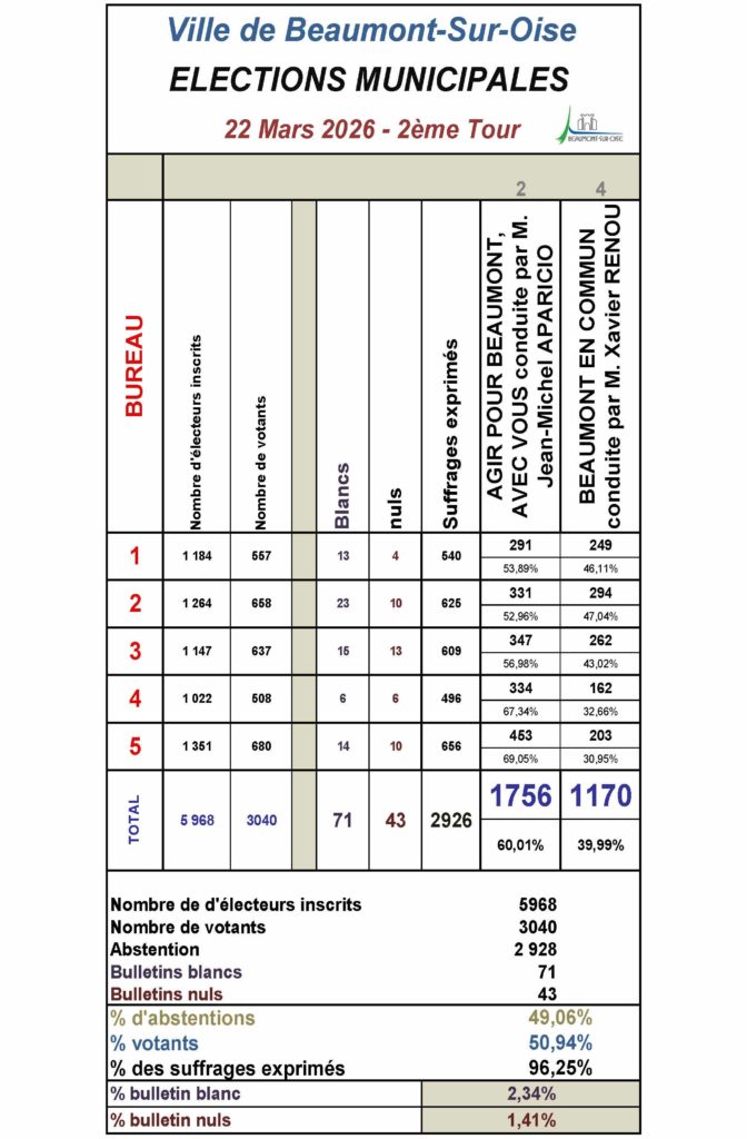 Résultats du deuxième tour des élections municipales – Dimanche 22 mars 2026