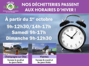 Retour à la page précédente VIGNETTE WEB HORAIRES HIVER DECHETTERIE 2025 800×600 Publié le 1 octobre 2025 Partager ce contenu... via Facebook via Twitter par mail